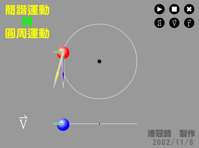 簡諧運動就是等速率圓週運動在直徑上的投影,畫面中紅球正在作等速率圓週運動, 想像一到光線從正上方照射下來,藍球就是紅球在水平線上的投影,正在作簡諧運動 ( Simple Harmonic Motion, S.H.M. ),分別按下右上方的 a、v、r 按鈕,可以顯示加速度、 速度、與位置向量。 仔細觀察,簡諧運動不僅位置是等速率圓週運動在直徑上的投影,連速度加、速度也都是呢!